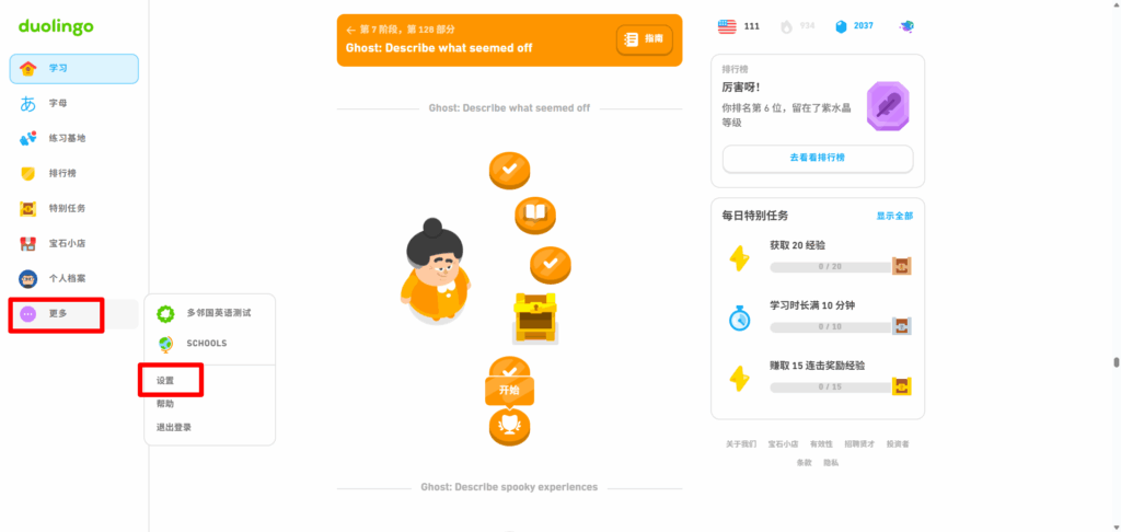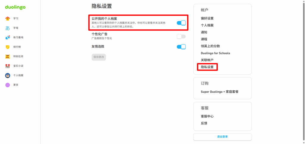 登录 Duolingo 网页版 https://duolingo.com/(这里可能要科学上网,不然可能会跳 .cn 的域名),点开左侧“个人资料”下面的“更多” > “设置”,然后在右侧“账户”下面点开“隐私设置”,把“公开我的个人档案”关闭后再打开。