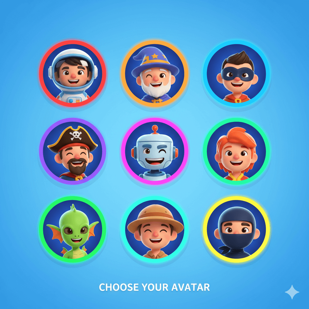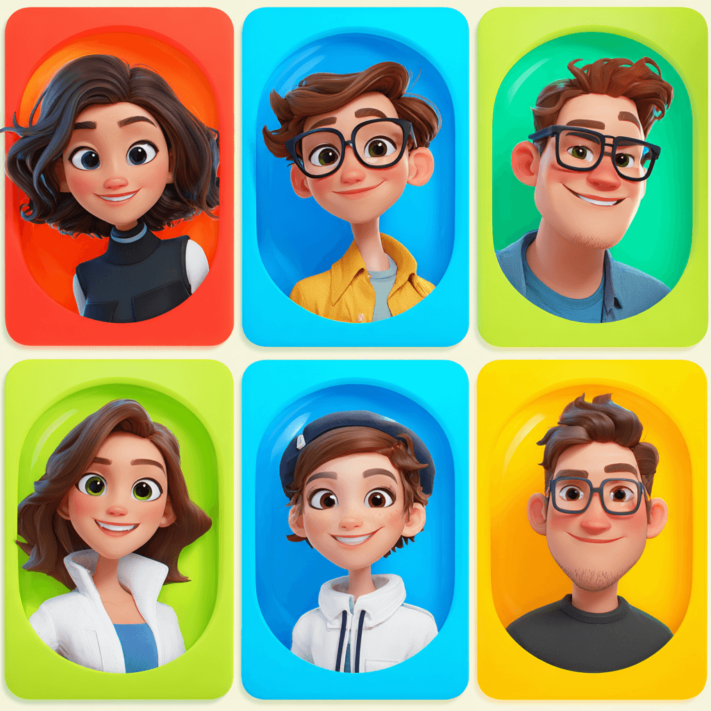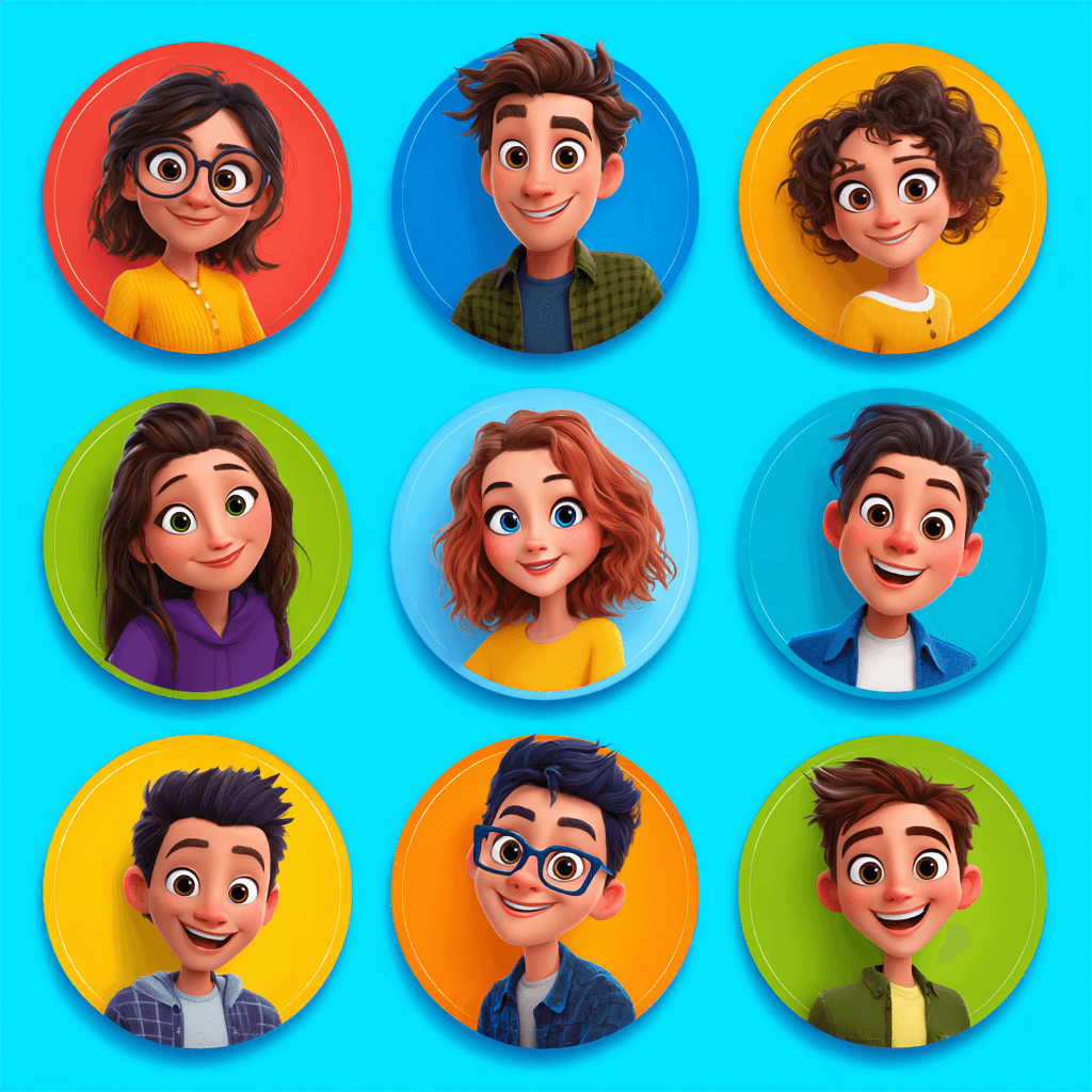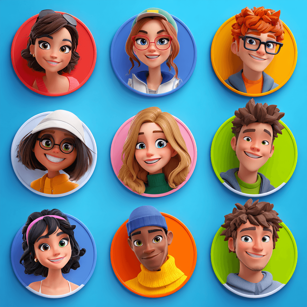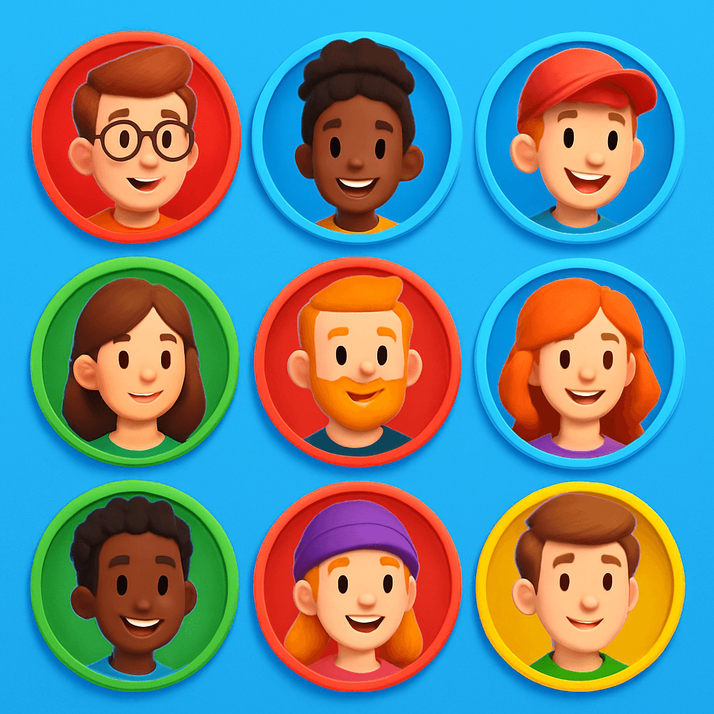 A 2x2 grid of colorful cartoon-style character avatars displayed on a bright blue background. Each avatar is placed inside a circular frame with a slightly darker inner background and a brighter border top-left red, top-right blue, bottom-left green, bottom-right yellow. Each character shows a cheerful, friendly face with smooth 3D shading, soft lighting, and clean vector illustration style. The composition is vibrant, modern, and ideal for a mobile game player selection screen.